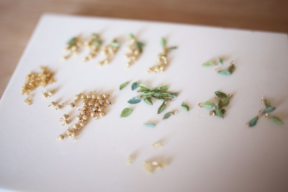 ミモザの葉は造花ですが、一枚一枚切り取ってライターで葉の周りを炙りほつけない様にしています。