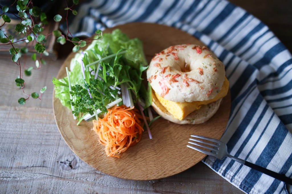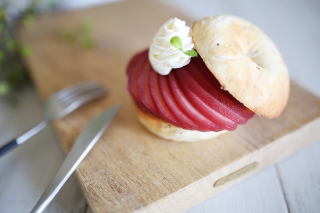 ベーグル専門店『アフィダメントベーグル』さんから頂いた国産小麦と天然酵母のベーグルでレシピを考案させて頂きました。